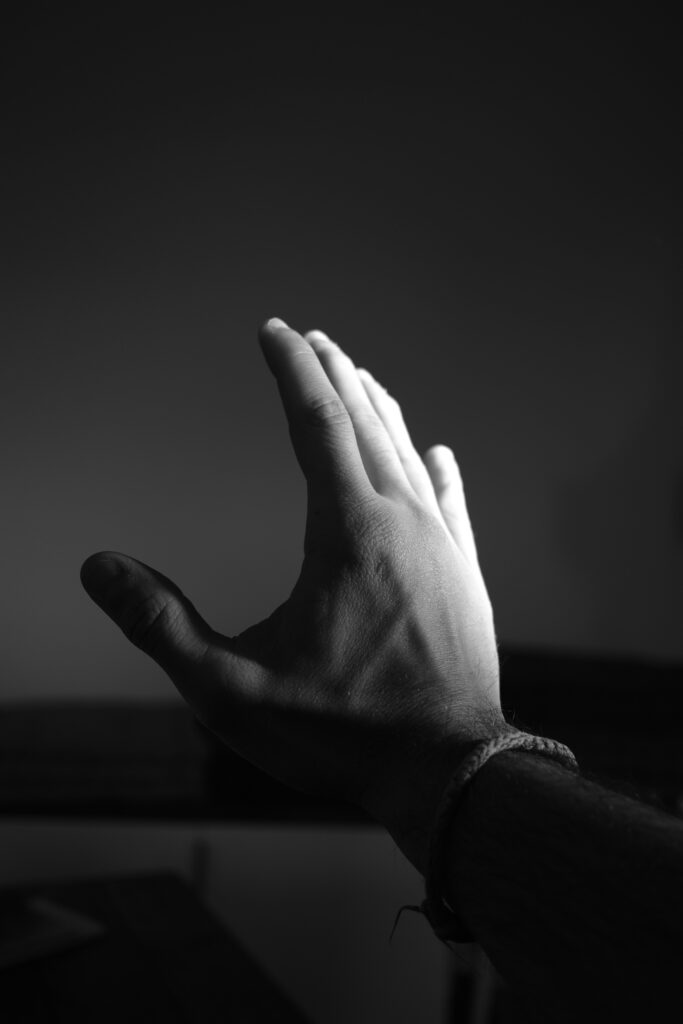 Alors, la lumière semble répondre : elle ondule, glisse le long des doigts, s’attarde au creux de la paume avant de disparaître. Dans ce dialogue muet entre chair et clarté, le temps s’efface. Il ne reste que la main, ouverte, comme une offrande, et le mystère lumineux qui s’y dépose.